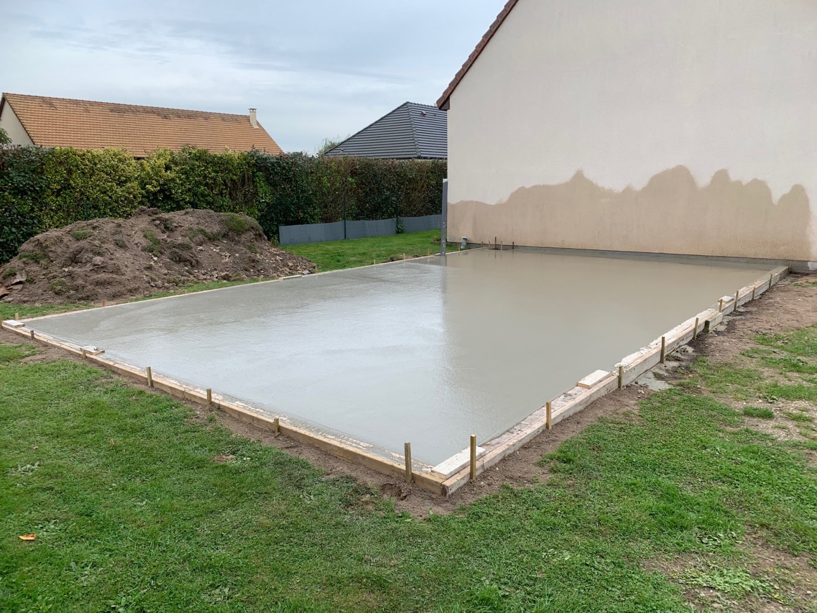 Aujourd’hui nous avons coulé la dalle béton dimension 10,00m de largeur par 6,00m de profondeur sur la commune de Tancarville 76. Bientôt pose d’un garage double pente en clin Douglas 42 mm. Une toiture 40°. Bien-sûr nous avons réalisé le permis de construire , terrassement, dalle béton. Fabrication et pose du garage prochainement.
