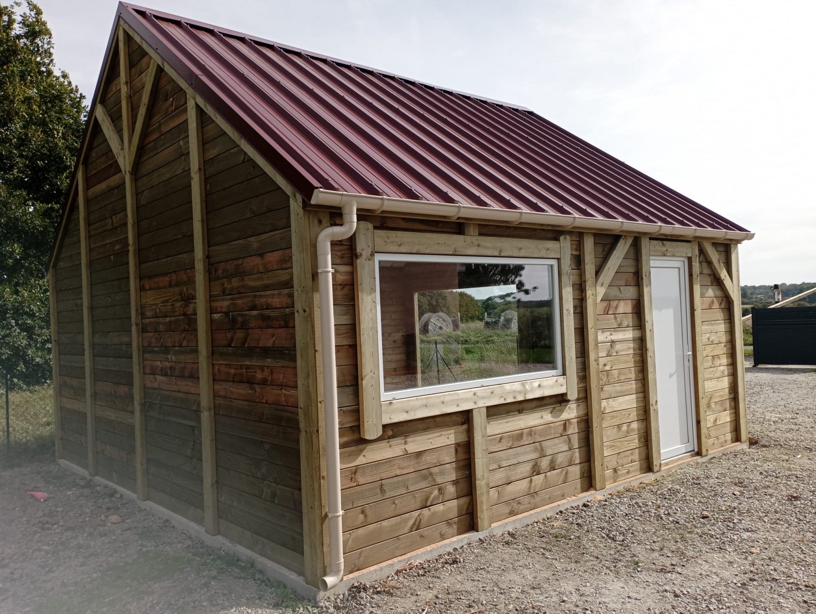 Construction d'un garage bois sur-mesure en clin Douglas 42mm traité auto-clave (classe 3). Couverture en bac acier anti condensation brun tuile. Porte de garage manuelle basculante, porte de service 0,80x2,00m et fenêtre fixe 1,00x2,00.