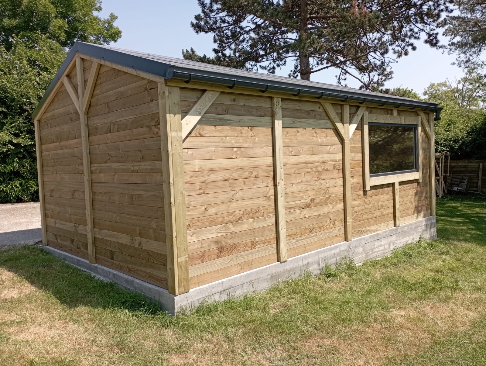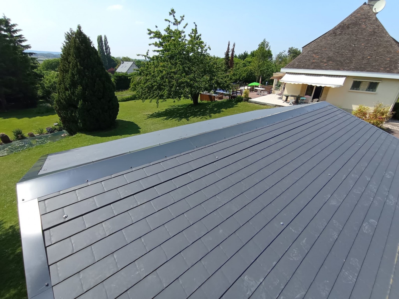 Réalisation d’un garage double pente de 4,50x7,00m avec une toiture imitation ardoise.