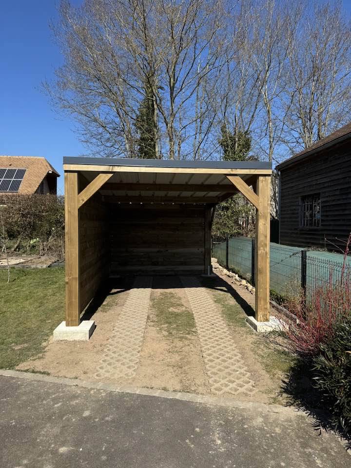Nos équipes sont intervenues au Neubourg pour la pose d'un carport monopente. Celui-ci est fermé sur 2 côtés. Un mois avant nos équipes ont réalisés les plots béton.