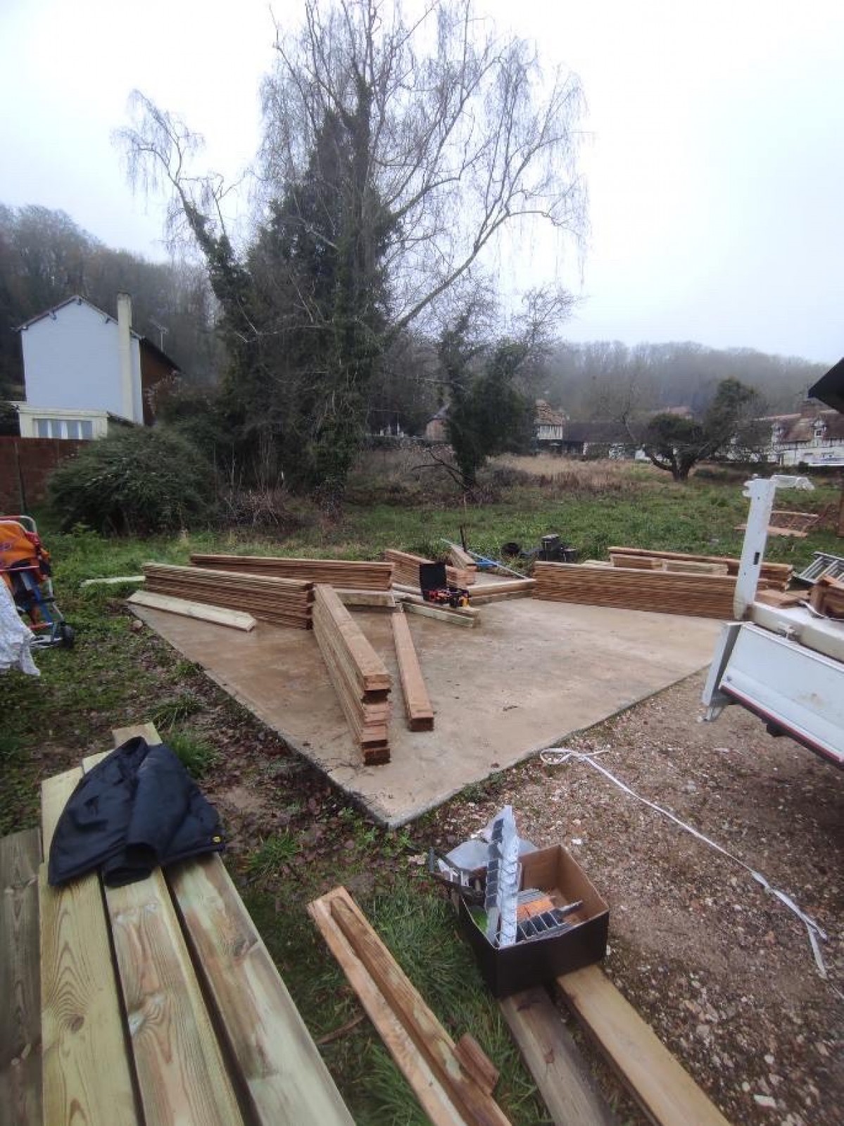 Nous voilà sur la commune de Bocasse pour la réalisation du terrassement,dalle béton,fabrication et pose du garage mono pente en clin de 42 mm Douglas.